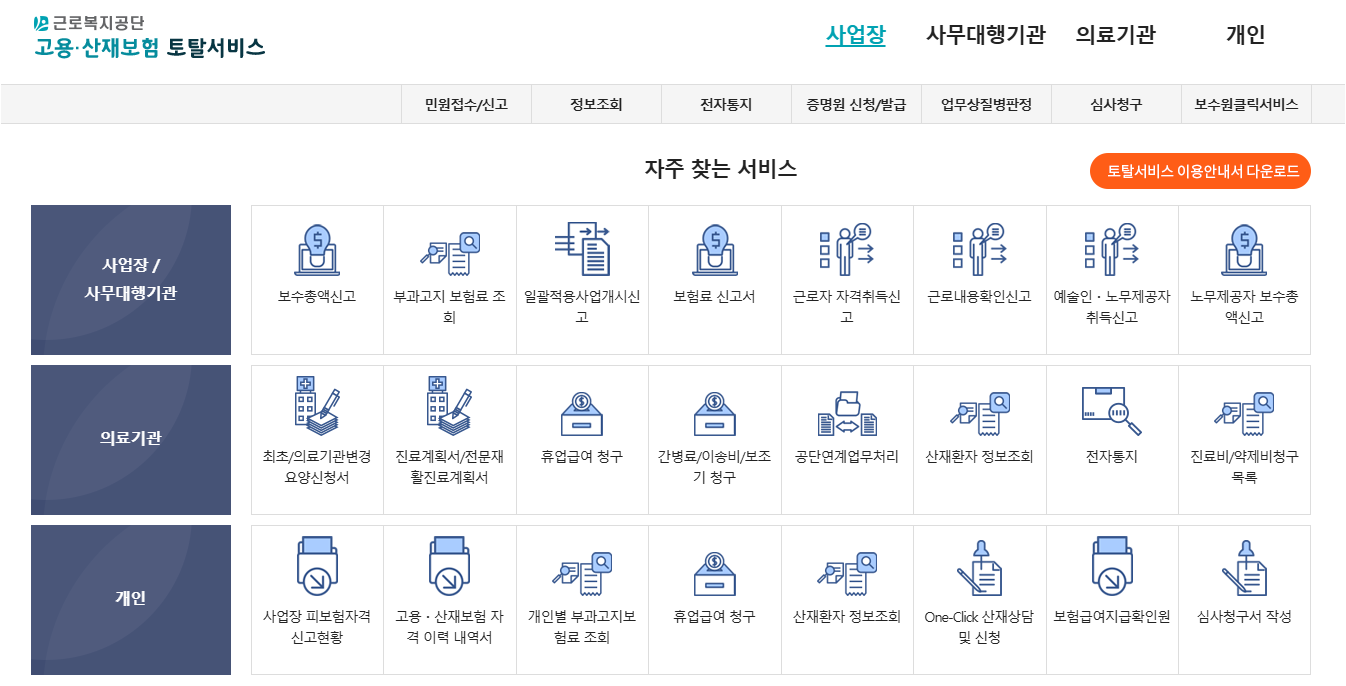 고용산재보험 관련 업무를 처리하려면 공식 홈페이지에 접속해야 합니다.