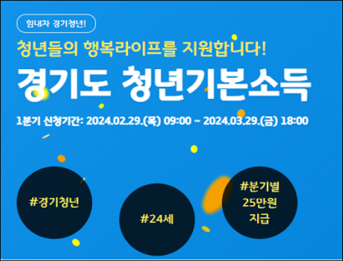 2024 경기도 청년기본소득 지원정책이 공개되었는데요. 지원대상은 신청일 기준 경기도에 주민등록을 두고 있는 24세 청년입니다. 지원기간은 2024-02-29(목) 9:00부터 2024-03-29(금) 18:00 까지인데요. 지원내용은 분기별 25만원 지급(최대 4분기 지원)해 줍니다. 지급은 지역화폐를 통해 지급되며 신청은 잡아바 어플라이를 통해 신청가능합니다.