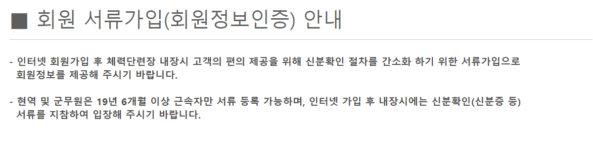 또한 회원가입 후 회원자격을 증명하기 위해 체력단련장 방문시 서류를 제공해야 합니다.