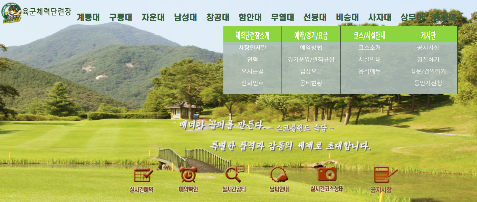 육군체력단련장 홈페이지 바로가기 안내입니다. 군장병을 위한 복지시설로 계룡대, 자운대, 무열대, 선봉대, 비승대등 총 12군데의 골프장을 예약할 수 있는데요. 홈페이지 주소는 다음과 같습니다.