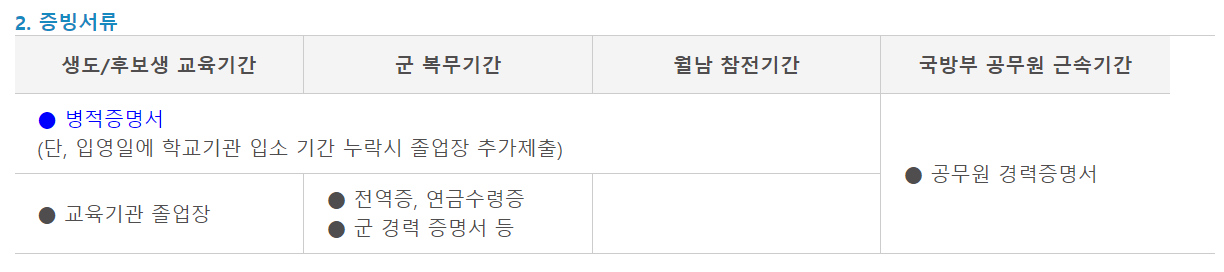 근속기간 산정시 필요한 증빙서류는 아래와 같습니다. (병적증명서 혹은 관련 교육기관 졸업장등)