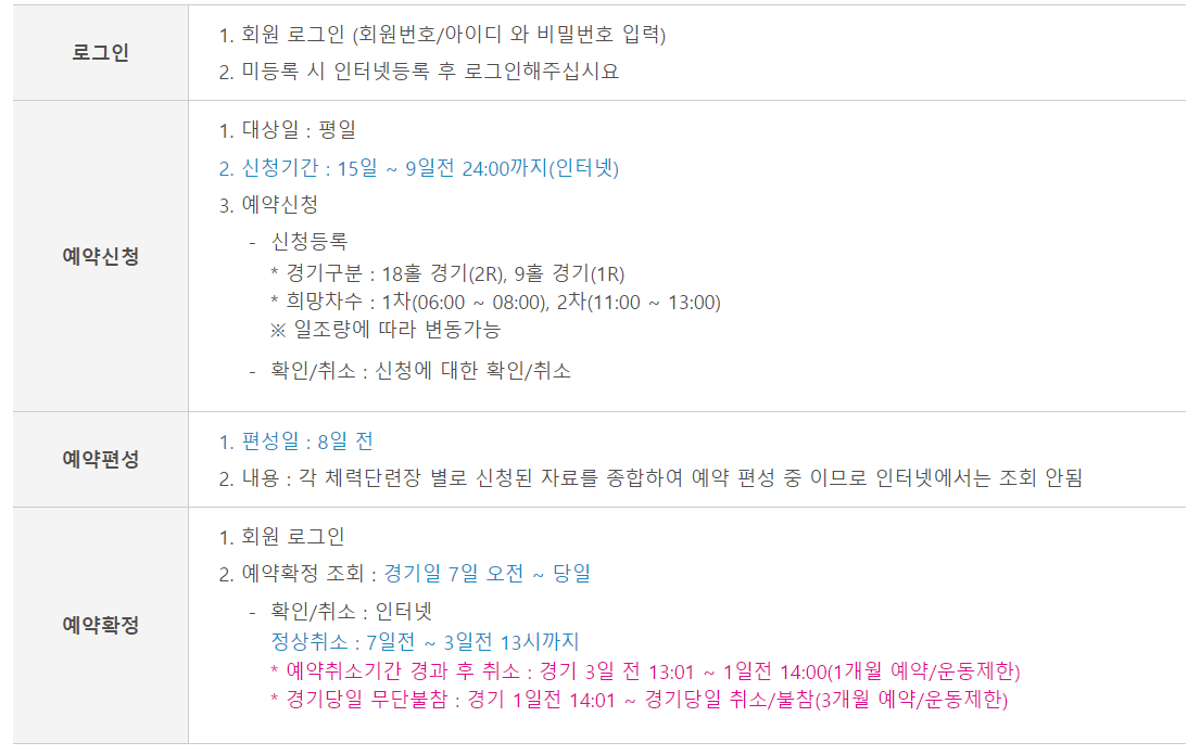 평일 경기 예약은 15일~9일전에 해야 하며 예약시 회원가입 및 로그인절차를 완료해야 합니다. 미등록시 인터넷 가입을 먼저 완료해야 합니다.