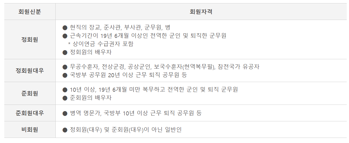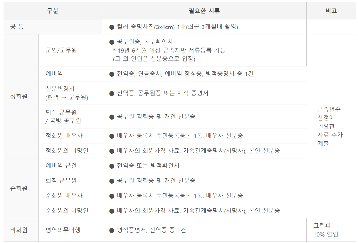 각 신분별 지참하실 서류는 다음과 같은데요. 정회원은 컬로 증명사진, 공무원증, 전역증등이 필요합니다. 서류는 최근 3개월이내 발급한 원본을 준비하셔야 합니다.