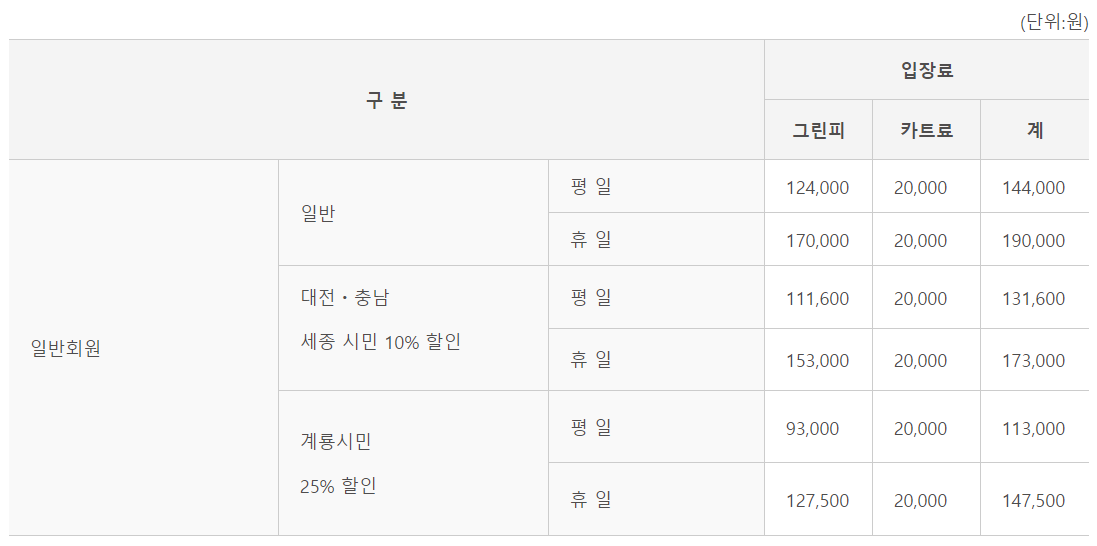 입장료는 각 체력단련장마다 조금씩 다르지만 대동소이합니다. 계룡대 18홀기준 입장료는 아래와 같습니다. 다른 체력단련장 시설의 이용료는 홈페이지에서 확인가능합니다.