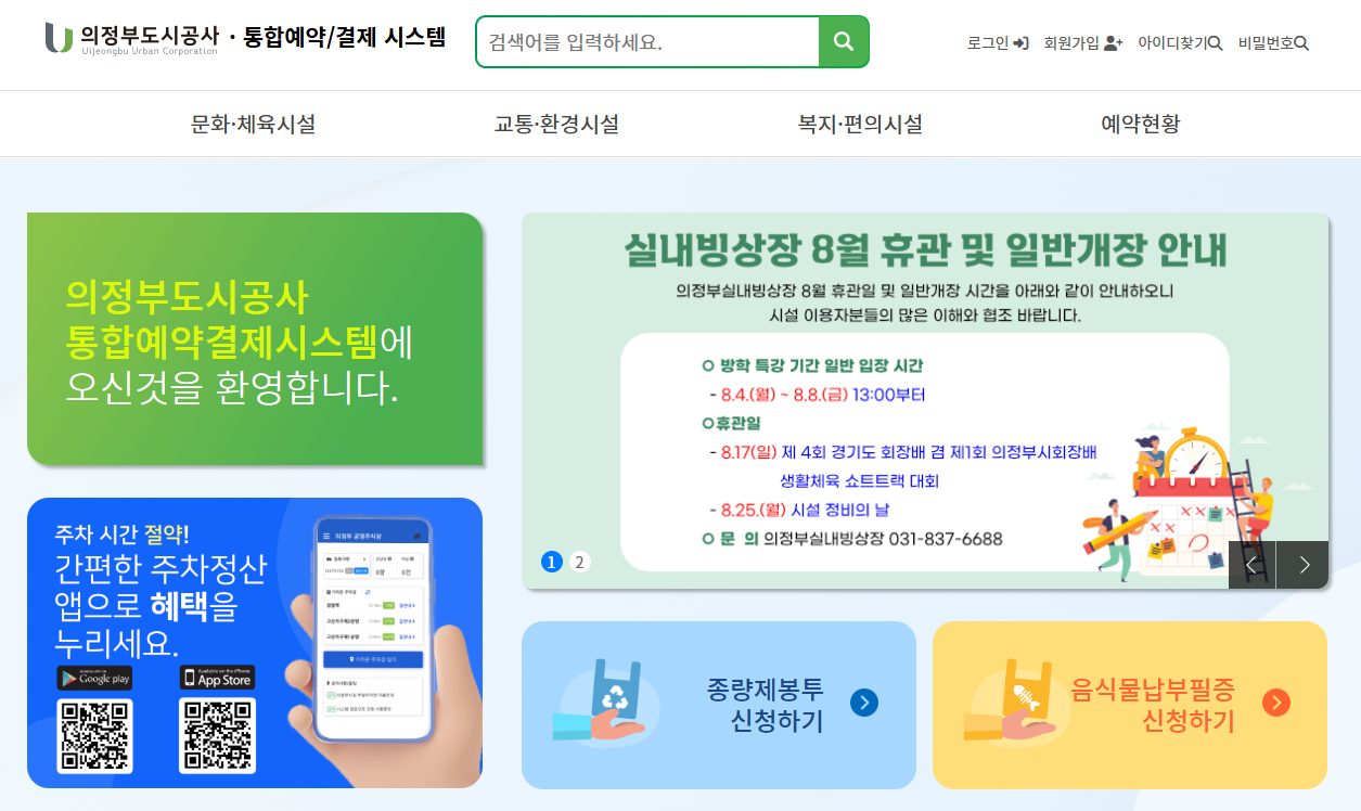 의정부도시공사에서 운영하는 통합예약시스템은 공공체육시설, 문화공간, 회의실 등 다양한 시설의 이용을 간편하게 예약할 수 있는 온라인 플랫폼입니다. 여러 시설이 흩어져 있던 기존의 개별 예약방식을 하나의 시스템으로 통합해, 보다 직관적이고 효율적인 예약 환경을 제공합니다.
