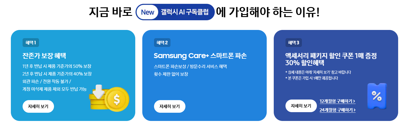 갤럭시 AI 구독클럽은 최신 기기 사용을 가볍게 만들면서도, 단기간 내 교체와 보상을 원하는 사용자에게 유리한 구조입니다. 유지관리나 보증 수리까지 포함된 패키지도 일부 제공되기 때문에, 구매 후 관리에 부담을 느끼는 사용자에게도 적합합니다.