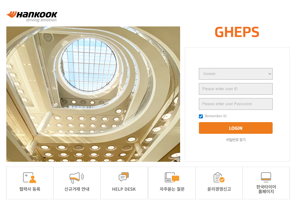 GHEPS 한국타이어 전자조달시스템은 국내외 협력사와의 원활한 소통과 투명한 거래를 위해 도입된 전자조달시스템입니다. 홈페이지 주소는 다음과 같습니다.