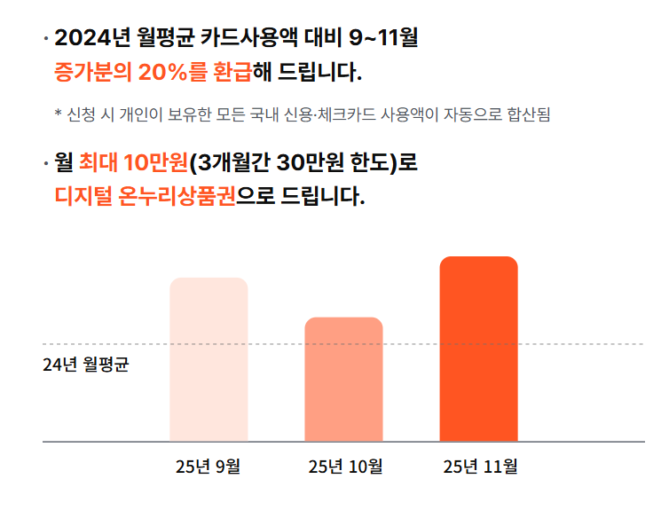 환급 혜택은 지난해 월평균 카드 사용액 대비 올해 9월부터 11월까지의 월별 증가분에 대해 20%를 돌려받는 형태입니다. 월 최대 10만 원, 총 3개월간 30만 원 한도로 지급되며, 디지털 온누리상품권으로 제공됩니다. 지급 일시는 9월 사용분의 경우 10월 15일, 이후 월별로 다음 달 15일에 이루어집니다. 이 상품권은 소상공인 매장에서 사용할 수 있어 경제 선순환을 돕습니다. 소비 증가분이 클수록 혜택이 커지므로, 계획적인 카드 사용을 추천드립니다.