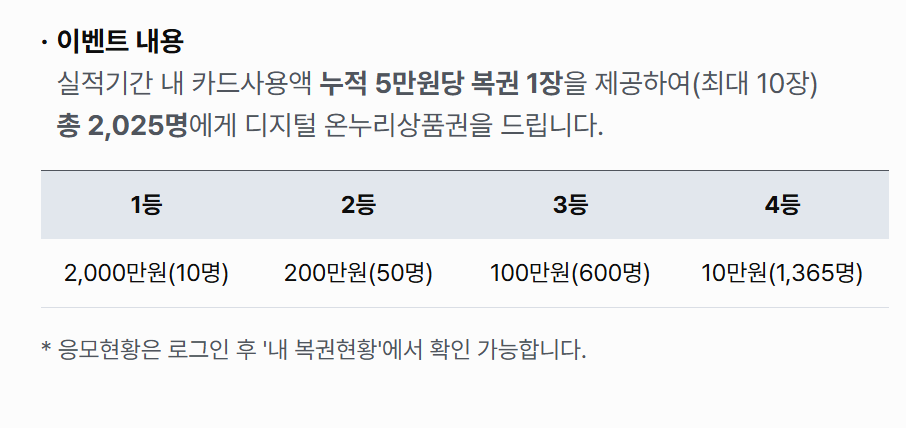 상생페이백 신청 시 자동으로 응모되는 상생소비복권 이벤트도 주목할 만합니다. 실적 기간 내 카드 사용액 5만 원당 복권 1장이 부여되며, 최대 10장까지 받을 수 있습니다. 응모 기간은 9월 15일부터 10월 12일까지이며, 실적 기간은 8월 1일부터 10월 12일입니다. 당첨자는 10월 말에 발표되며, 11월 중 지급이 이루어집니다. 총 2,025명에게 디지털 온누리상품권이 지급되는데, 1등은 2,000만 원(10명), 2등은 200만 원(50명), 3등은 100만 원(600명), 4등은 10만 원(1,365명)입니다. 응모 현황은 누리집 로그인 후 확인할 수 있습니다. 이 이벤트는 환급 외에 추가적인 재미와 혜택을 제공합니다.
