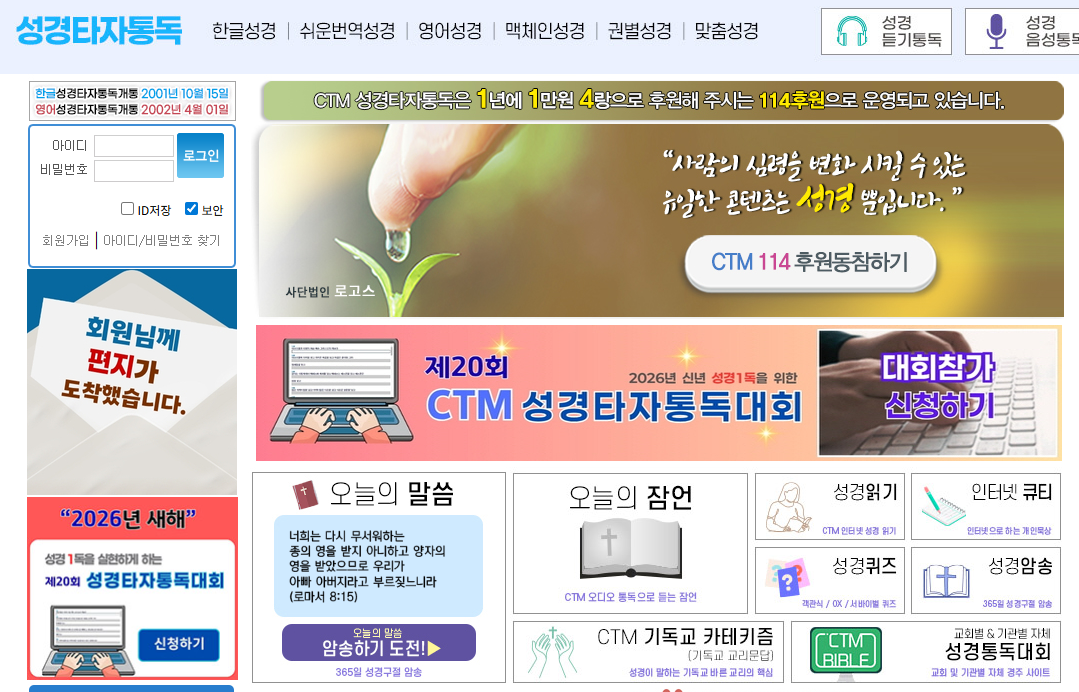 성경타자 통독은 성경 말씀을 타자로 직접 입력하면서 성경 내용을 더 깊이 묵상하고, 동시에 타자 연습도 할 수 있는 독특한 방법입니다. 홈페이지 주소는 다음과 같습니다.